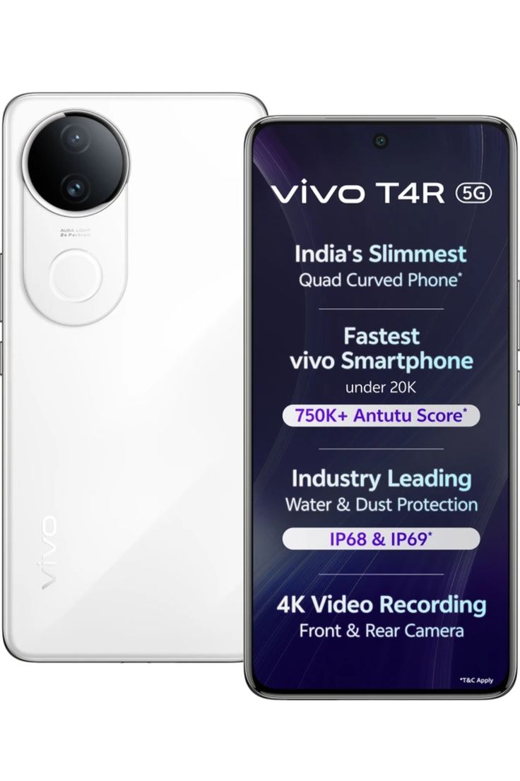 Vivo T4R is a trusted Vivo 5G phone having AMOLED curved screen of 6.77 inches and 120Hz refresh rate. The phone is dust and water resistant and comes in a modern punch-hole design.