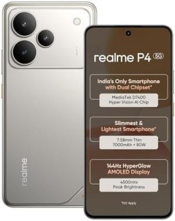 Realme P4 is an influential and high-speed 5G smartphone that has a 6.77-inch screen and 144Hz refresh rate Hyper Glow AMOLED screen. It is waterproof and dust resistant and is smooth with holes punched on it.