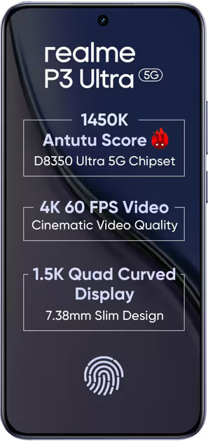 Realme P3 Ultra is a fast 5G phone below 20000 priced with a 6.83-inch AMOLED curved screen and 120Hz refresh rate. It is water and dustproof and has a luxury appearance. It is powered by MediaTek Dimensity 8350 Ultra processor and has Android 15. The rear camera of 50MP captures 4K at 60 frames per second and the front camera is 16 MP with FHD videos. The super fast charging(80W) battery of 6000mAh means long usage.